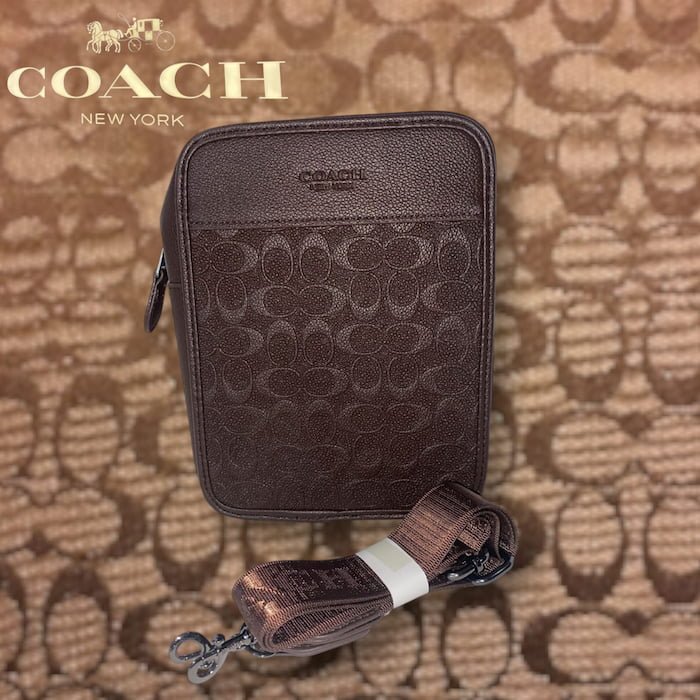Bolso tipo bandolera Coach, elegante y compacto. Diseño en piel con textura, correa ajustable y gran estilo. Ideal para uso diario.