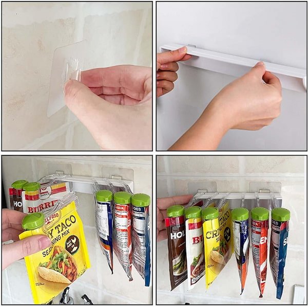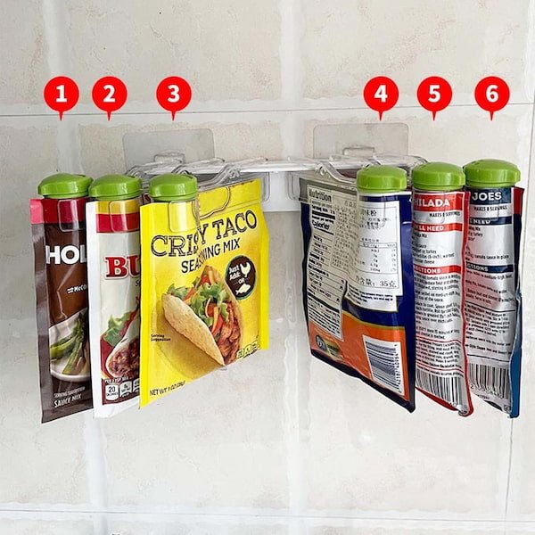 - Organizador Multifuncional con Clip de Sellado: Equipado con un organizador de clip de sellado, este estante mantiene tus condimentos frescos y protegidos. Los clips aseguran que los paquetes de especias y otros productos se mantengan sellados, evitando derrames y preservando la frescura.