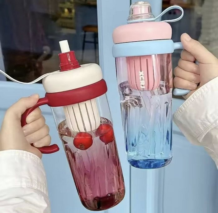 Bote con asa de 950 ml, incluye popote con tapón e infusor de té, con agarradera resistente de plástico durable y de buena calidad.