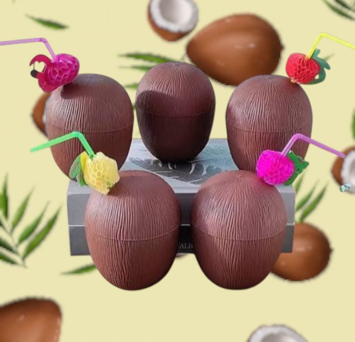 Bote en forma de coco con tapa y popote, de plástico resistente y de excelente calidad. Ideal para tus bebidas con estilo y diversión.