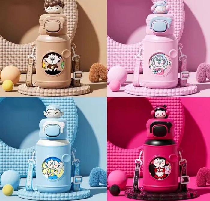 Bote térmico con diseño de varios personajes, ideal para conservar bebidas frías o calientes con estilo y diversión.