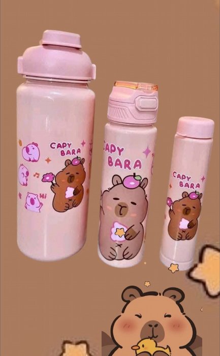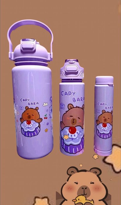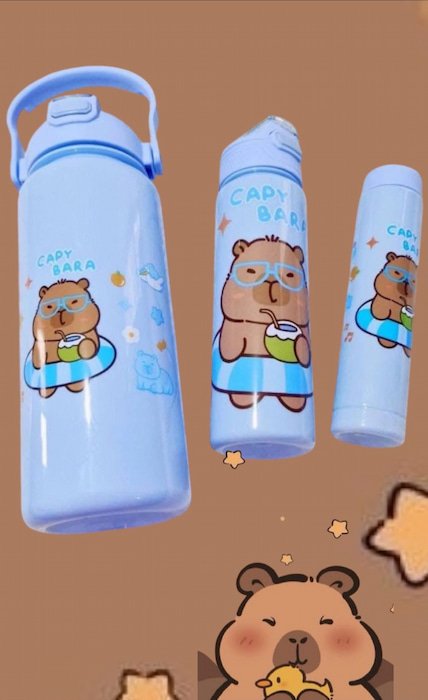 Bote triple Capibara de buena calidad, resistente y práctico, incluye tres botes de 2L, 1L y 350ml. Ideal para la escuela o uso diario.