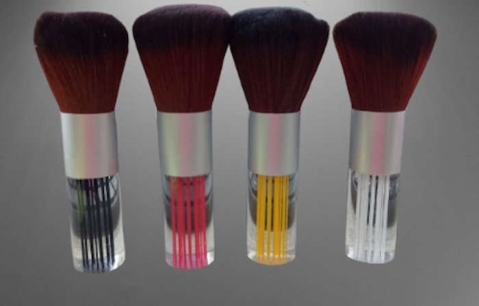 Brocha para maquillaje pequeña con agarradera de diseño transparente y rayitas, elegante y funcional. Perfecta para detalles y aplicaciones precisas, su diseño compacto y moderno la hace fácil de usar y llevar. Ideal para retoques y viajeros.
