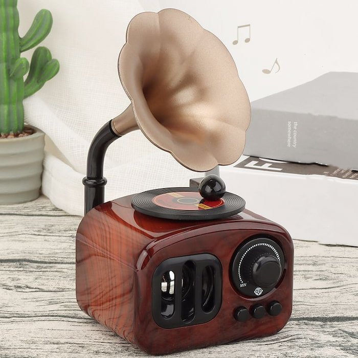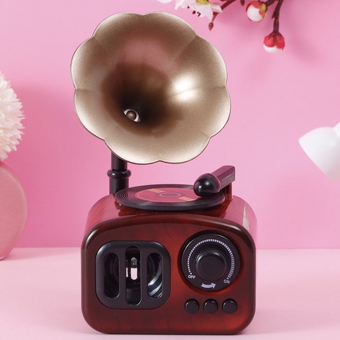 Fonógrafo musical súper lindo y elegante, que gira al compás del sonido. Perfecto para decoración, combina estilo y buena calidad, haciendo de cualquier espacio un rincón único y encantador.