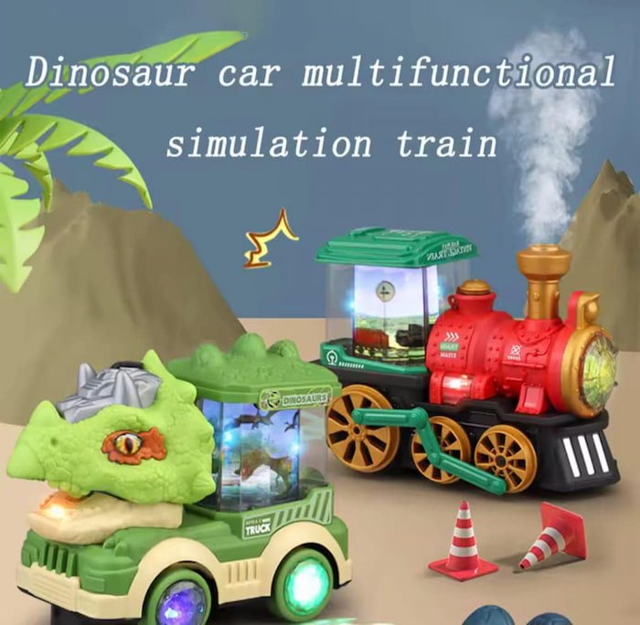 Carrito Dino con sonido y luz, juguete interactivo que combina diversión y estímulos visuales y auditivos para los más pequeños.