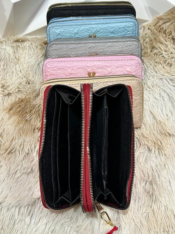 - Cartera de Doble Cierre: Una cartera elegante y funcional que cuenta con dos compartimentos principales con cierres independientes, diseñada para ofrecer una organización eficiente y seguridad adicional para tus pertenencias.