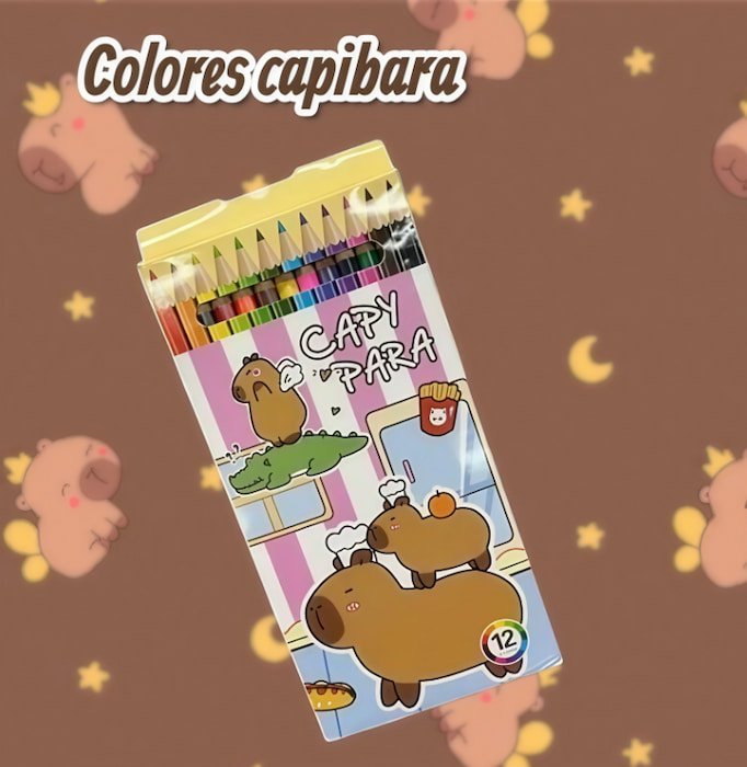 Set de 12 lápices de colores con diseño de Capibara, cada uno en un color diferente. Viene en práctica cajita, ideal para la escuela, dibujo o creatividad en casa.