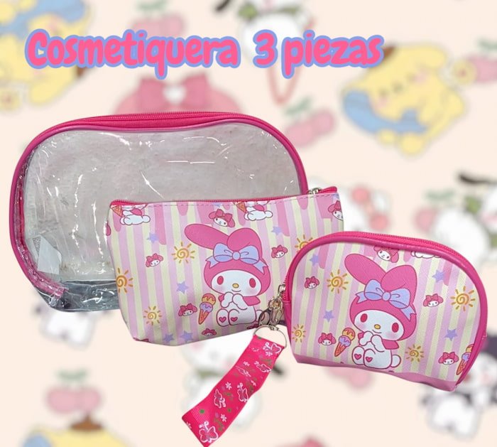 Cosmetiquera de personaje Sanrio que incluye 3 piezas súper bonitas. Práctica, adorable y de buena calidad.