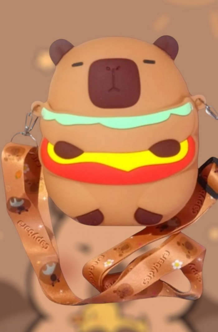 Bolsita de silicón con personaje de capibara hamburguesa, diseño bonito y de buena calidad. Ideal para guardar objetos pequeños con estilo.