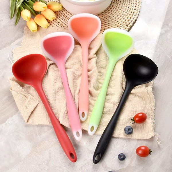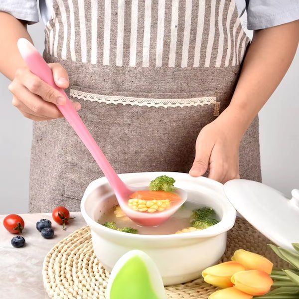 - Material de Silicona Flexible: Fabricadas en silicona de alta calidad, estas cucharas son extremadamente flexibles y resistentes al calor. Pueden soportar temperaturas elevadas sin deformarse ni liberar sustancias nocivas, lo que las hace ideales para usar en sopas, guisos y otras comidas calientes.