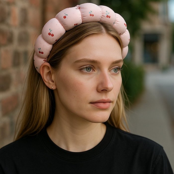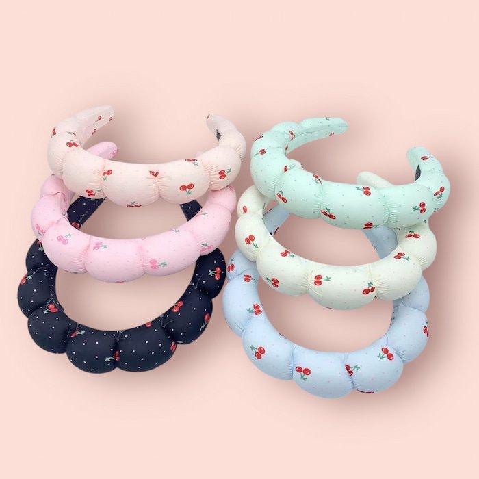 Diadema Cherry tipo almohadilla, cómoda y suave. Ideal para uso casual o como accesorio durante la rutina de skincare diaria.