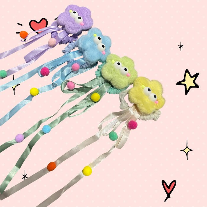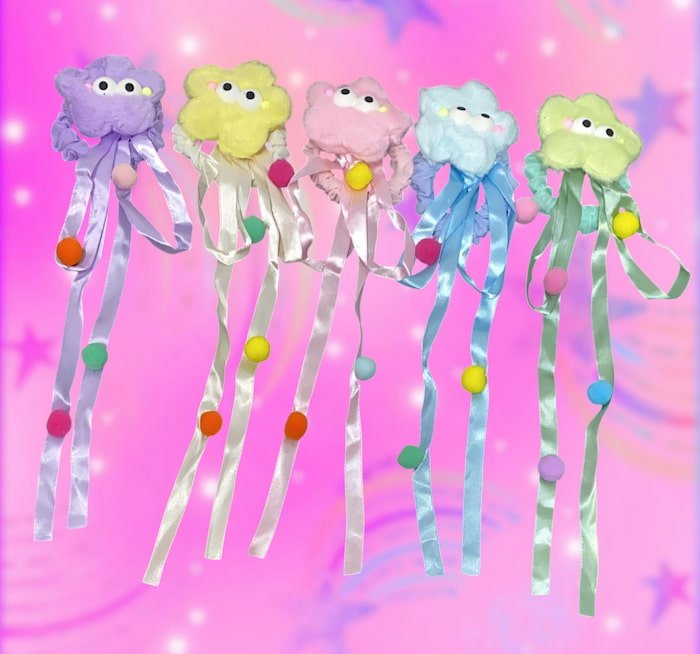 Dona kawai con diseño de estrellas, listón colgante y detalles de pompositos. Disponible en varios colores y de buena calidad.