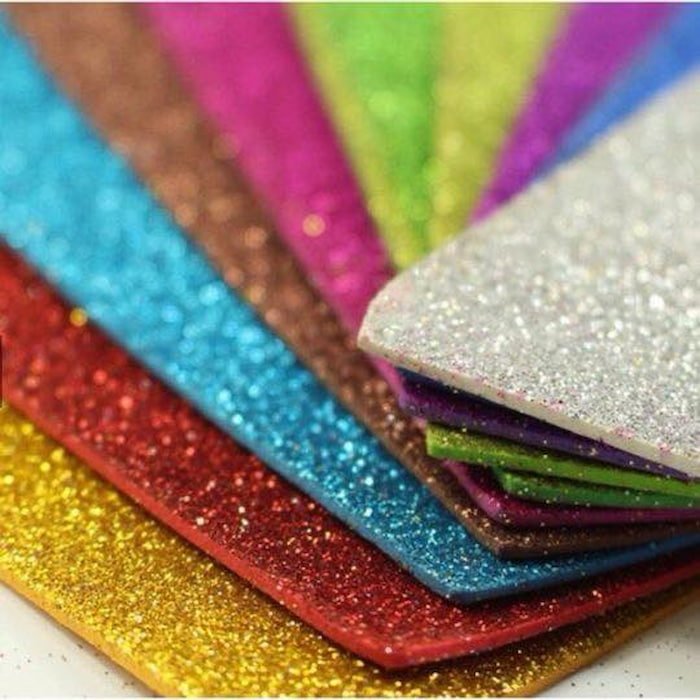 Foamy con escarchas brillantes, ideal para manualidades creativas y decoraciones divertidas.