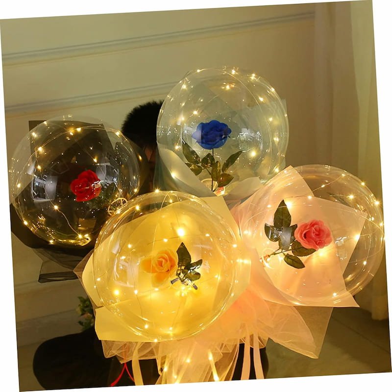 Este globo LED combina una iluminación suave con una hermosa rosa incorporada. Ideal para decorar espacios y crear ambientes románticos o festivos, ofrece un toque elegante y luminoso que realza cualquier ocasión especial.