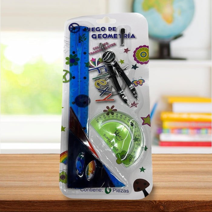 Juego geométrico flexible de buena calidad. Incluye dos escuadras, regla de 30 cm, transportador y compás. Ideal para escuela o trabajo.