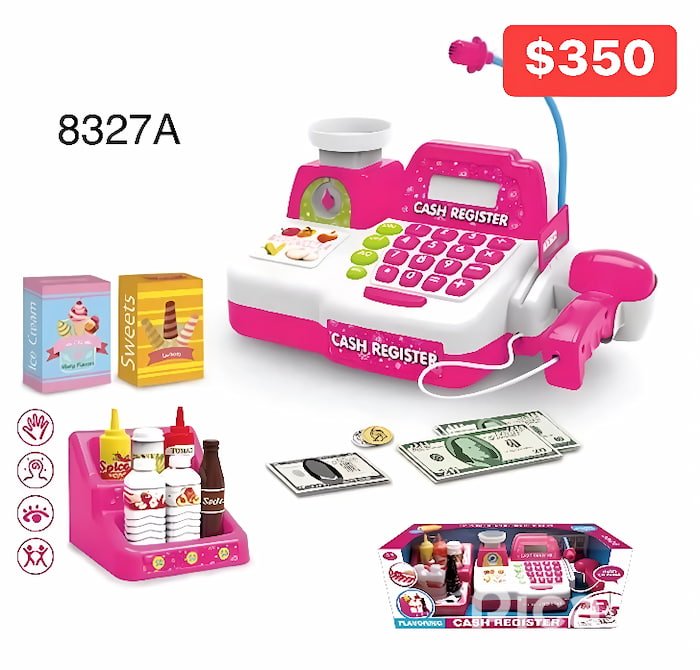 Juguete Caja Registradora Mod. 8327A, con sonidos y accesorios que simulan una experiencia de compra real. Ideal para fomentar el juego de roles y el aprendizaje en los niños.