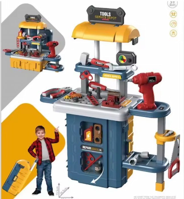 Kit de Herramientas Mod. 8122P, con diversos utensilios de juguete para que los niños se diviertan imitando trabajos de construcción. Ideal para fomentar la creatividad y habilidades manuales.