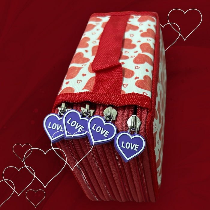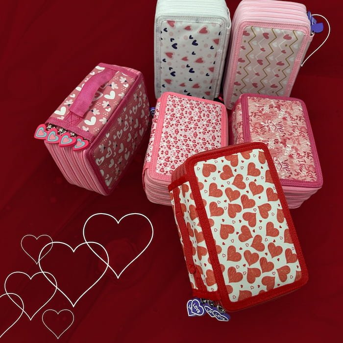 Lapicera con diseños de corazones, 4 cierres y súper buena calidad. Ideal para la escuela y mantener todo organizado con estilo.