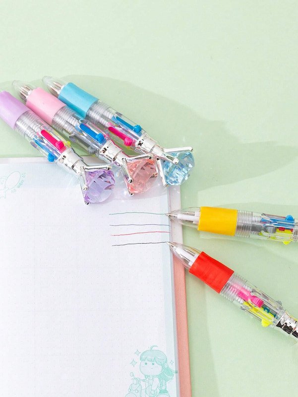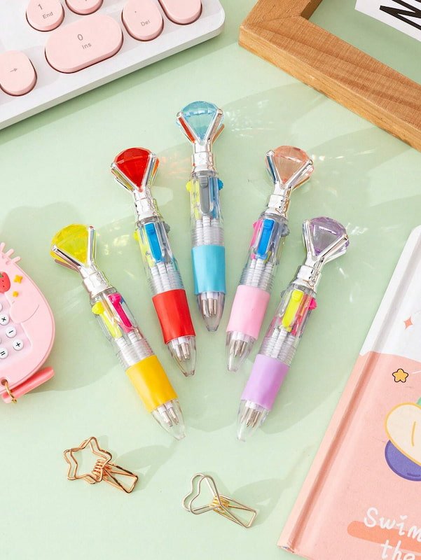 El «lapicero diamante multicolor» es un bolígrafo con 6 tintas diferentes en un solo instrumento. Con un diseño elegante en forma de diamante, permite cambiar entre colores fácilmente, ideal para notas, dibujos y escritura creativa.
