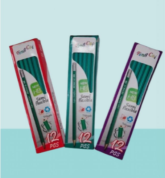 Lápiz semi flexible con forma triangular, cómodo para escribir. Contiene 12 piezas, ideal para uso escolar o diario.