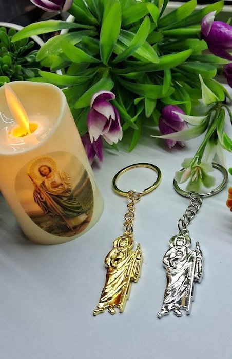Mantén cerca tu fe y protección con nuestro Llavero de San Judas de metal de buena calidad . ¡Un pequeño pero poderoso recordatorio de esperanza en tu vida diaria!