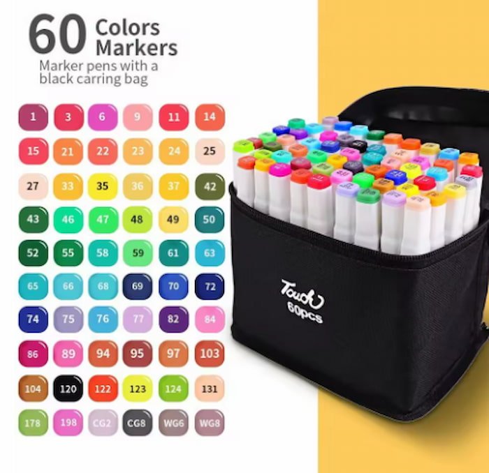 Set de 60 marcadores Touch de diferentes colores, con doble punta: una delgada para detalles y otra gruesa tipo biselada para trazos amplios. Tinta de alta calidad, ideal para arte, diseño y dibujo creativo.