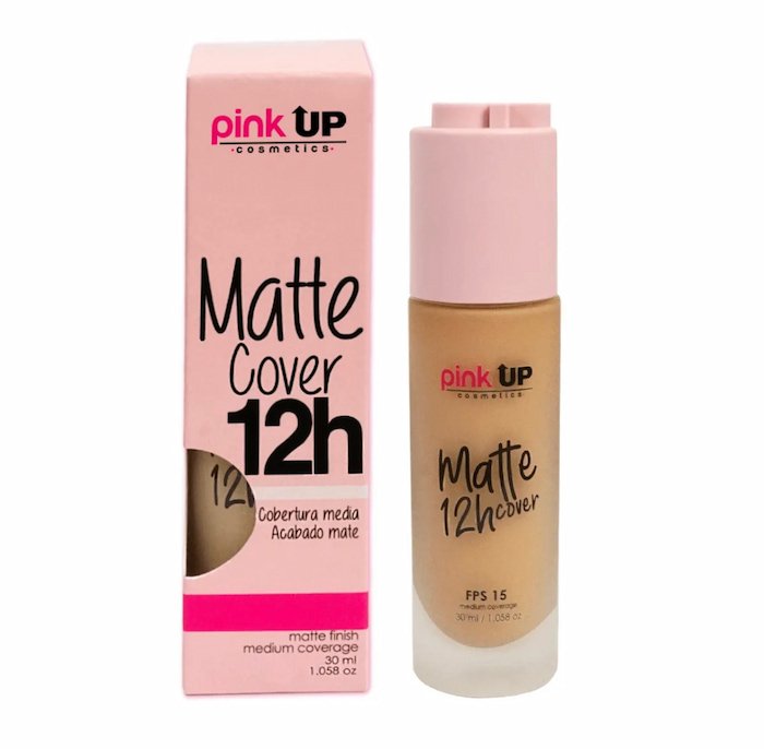 Maquillaje líquido mate 12H Pink Up, con textura suave que proporciona una cobertura de larga duración, controlando el brillo y dejando un acabado impecable durante todo el día.