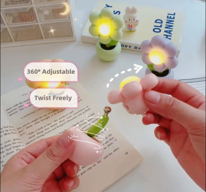 Mini lámpara de flor con luz cálida y cabeza móvil 360°, perfecta para iluminar con encanto y total flexibilidad.