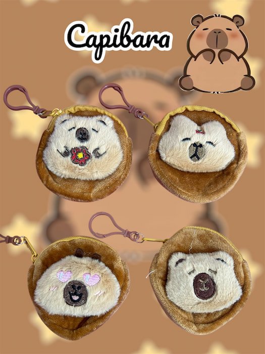 Monedero redondo afelpado con diseño de capibara. Suave, tierno y perfecto para guardar monedas o pequeños objetos.