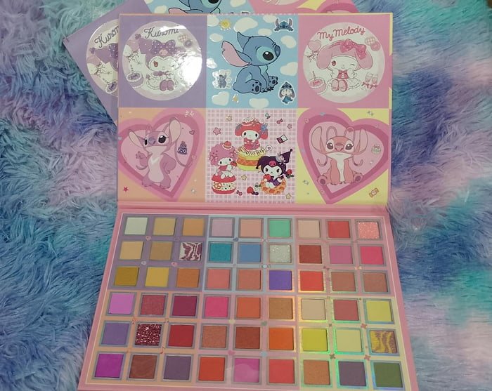 Paleta Sanrio con 54 colores, de excelente pigmentación y variedad. Perfecta para crear looks vibrantes y duraderos, ideal para amantes del maquillaje y los tonos llamativos.