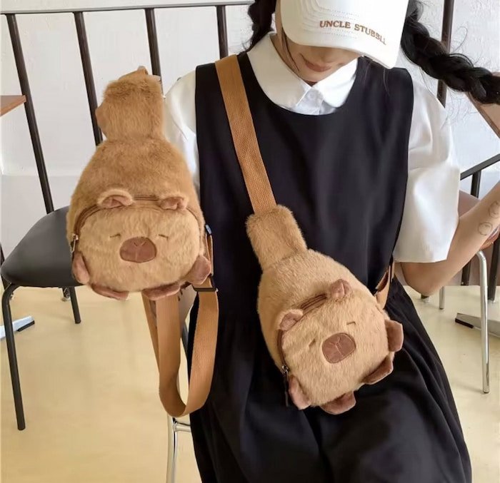Pechera Capibara Mini unisex de felpa, con textura suave y agradable, diseñada para niñas y niños. Súper linda y cómoda para llevar tus objetos favoritos.
