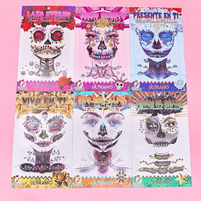 Pedrería con pegamento para Catrina, fácil de colocar y retirar. Ideal para disfraces, cubre asta el cuello, viene en varios modelos diferentes.