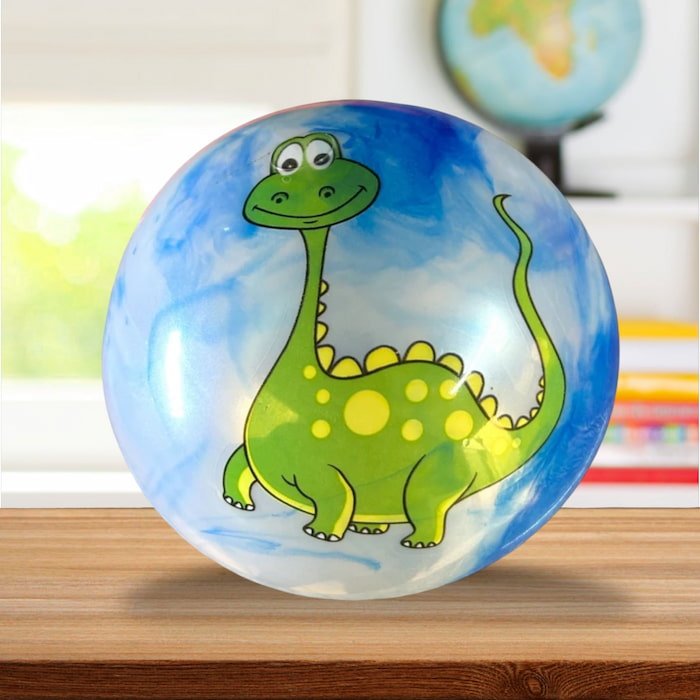 Pelota con divertidos dibujos de dinosaurios, ideal para el entretenimiento de los pequeños. Colorida y resistente.