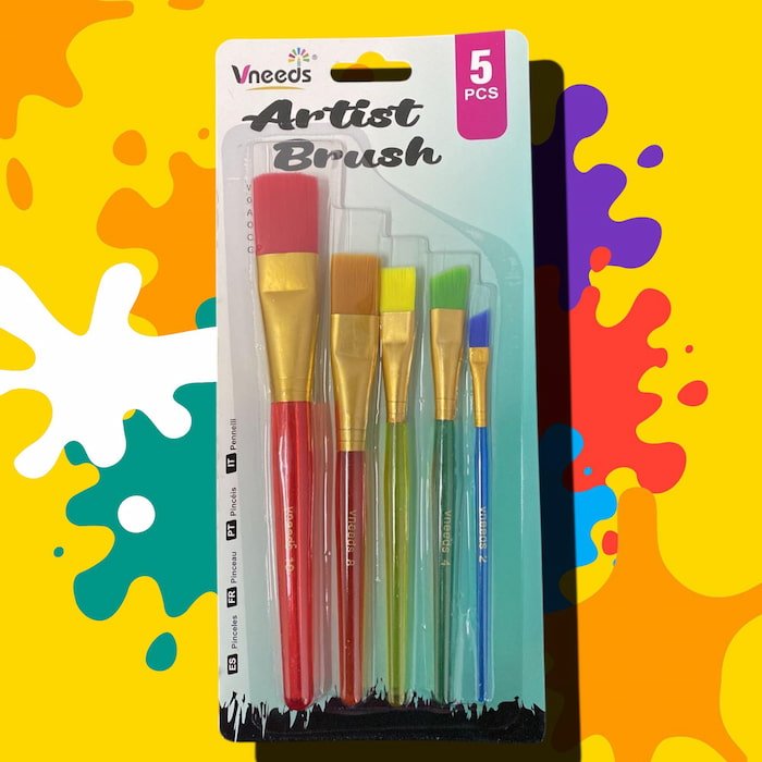Paquete de pinceles escolares con 5 piezas en diferentes formas y medidas, resistentes y de buena calidad, ideales para pintar y hacer manualidades.