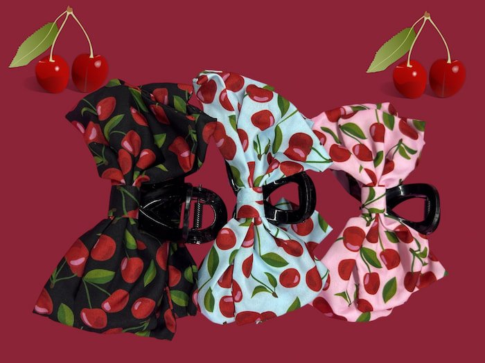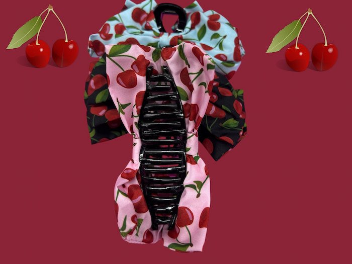 Pinza con estampado de cereza, bonita y de buena calidad. Ideal para sujetar el cabello con estilo y un toque divertido.