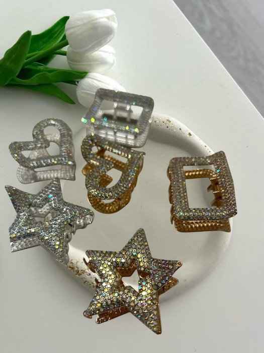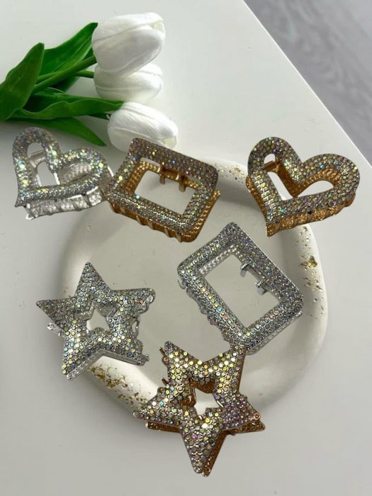 Pinza con pedrería: elegante accesorio en forma de corazón, estrella y cuadrada. Brilla con estilo y sujeta tu cabello con un toque de glamour. Ideal para cualquier ocasión.