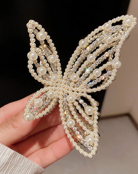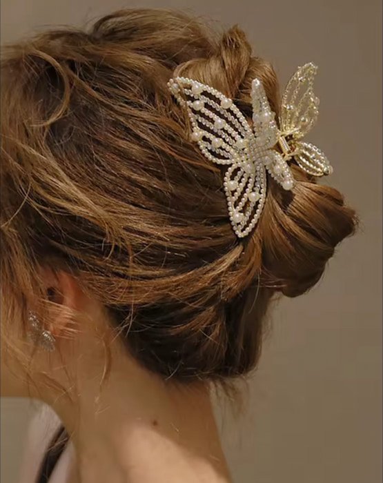 Elegante pinza en forma de mariposa, hecha de metal y decorada con delicadas perlitas. Ideal para un toque femenino y chic.