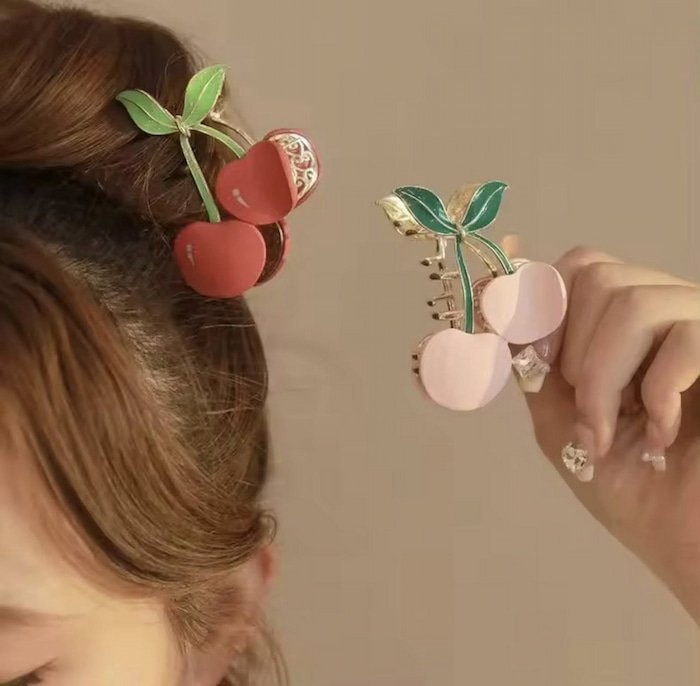 Pinza para el cabello en forma de cereza, hecha de metal. Añade un toque divertido y original a tu peinado.