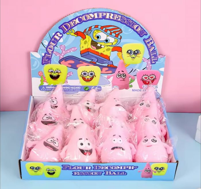 Muñequito antiestrés de Patricio Estrella, relleno de arena moldeable. Suave y flexible, ideal para manipular a gusto y aliviar el estrés de forma divertida.