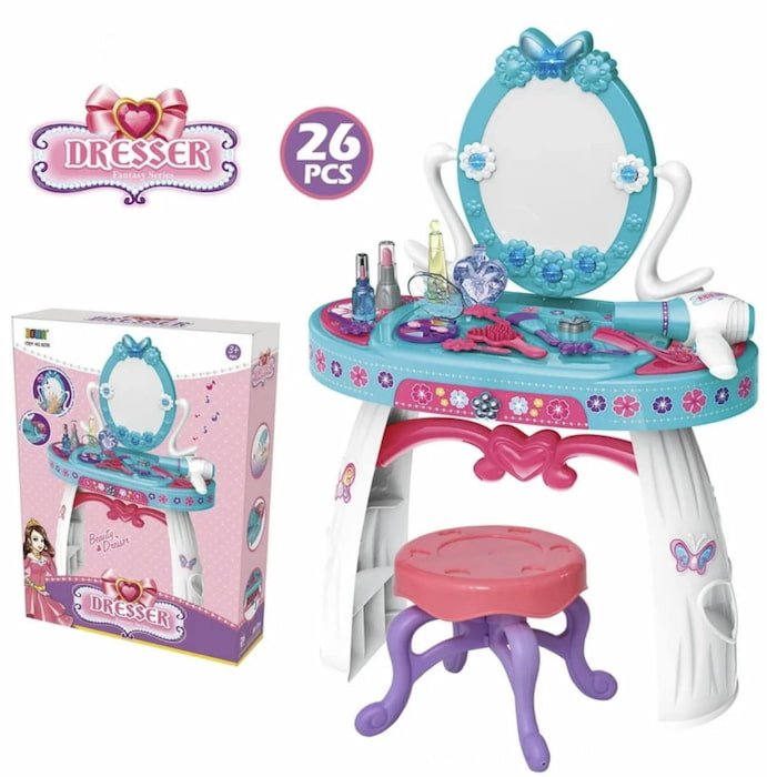 Tocador de Princesa Infantil Mod. 8238, con espejo y accesorios encantadores. Perfecto para que las niñas se diviertan imitando el estilo de una princesa mientras desarrollan su creatividad.