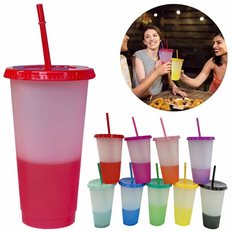 Vasos de Plástico Reutilizables de 24 OZ con Cambio de Color – Sin BPA, con Tapas y Popotes
